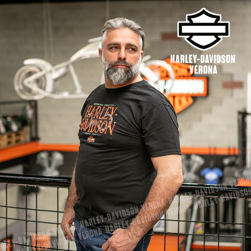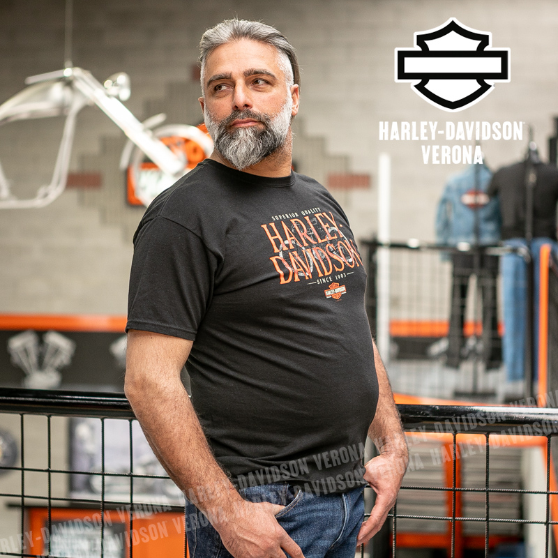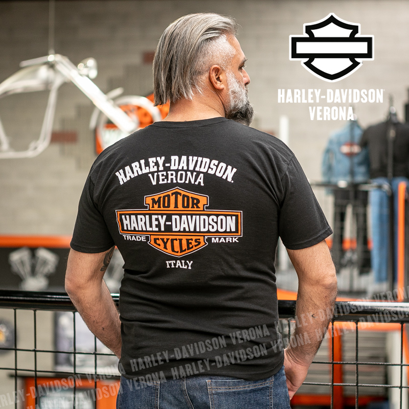 Indossa i colori di H-D® Verona! Nuovissima collezione 2026 di t-shirt in classico nero con scritta arancio su sfondo di moto vintage, perfetta per mostrare la tua appartenenza alla famiglia Harley-Davidson Verona o per un ricordo unico della tua visita alla città di Romeo e Giulietta! Luca è alto 177 cm e indossa la taglia L.