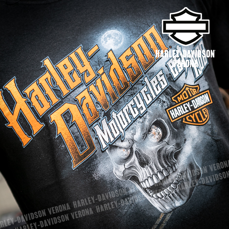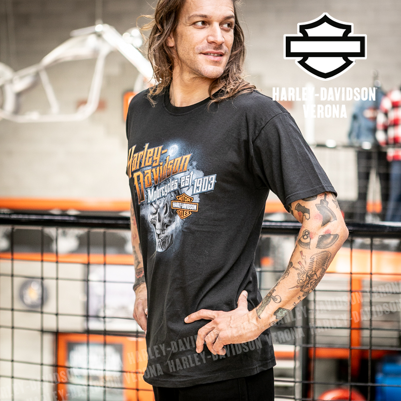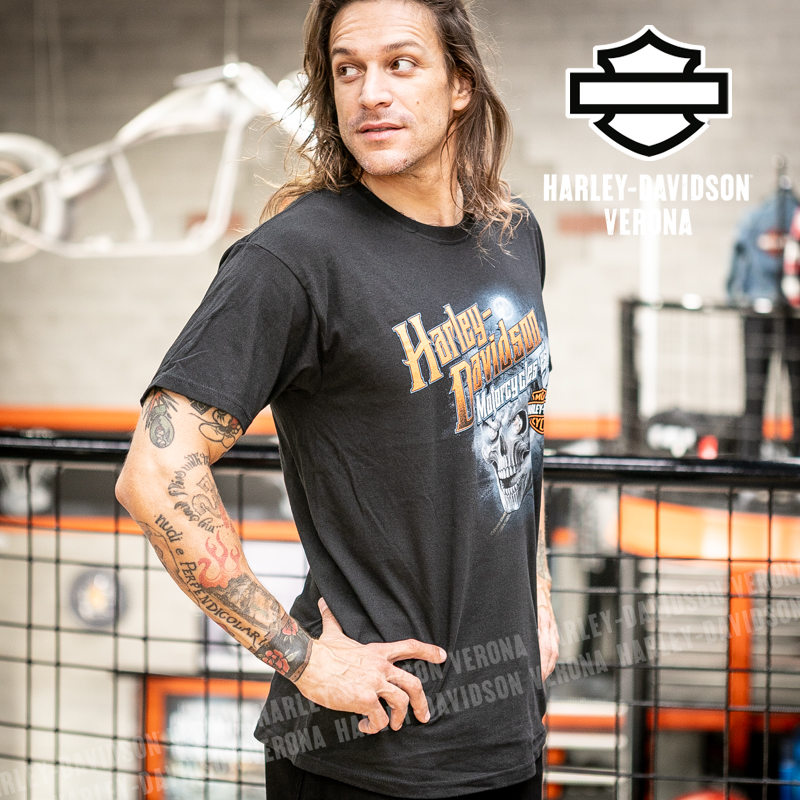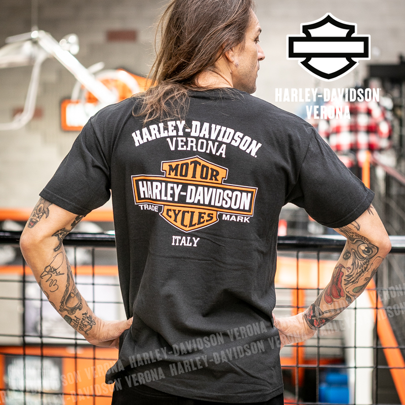 Indossa i colori di H-D® Verona! Nuovissima collezione di t-shirt 2026 in total black con teschio e grafica in arancione, perfette per mostrare la tua appartenenza alla famiglia Harley-Davidson Verona o per un ricordo unico della tua visita alla città di Romeo e Giulietta! Timothy è alto 180 cm e indossa la taglia L.