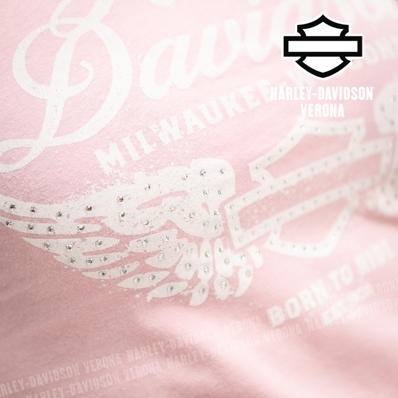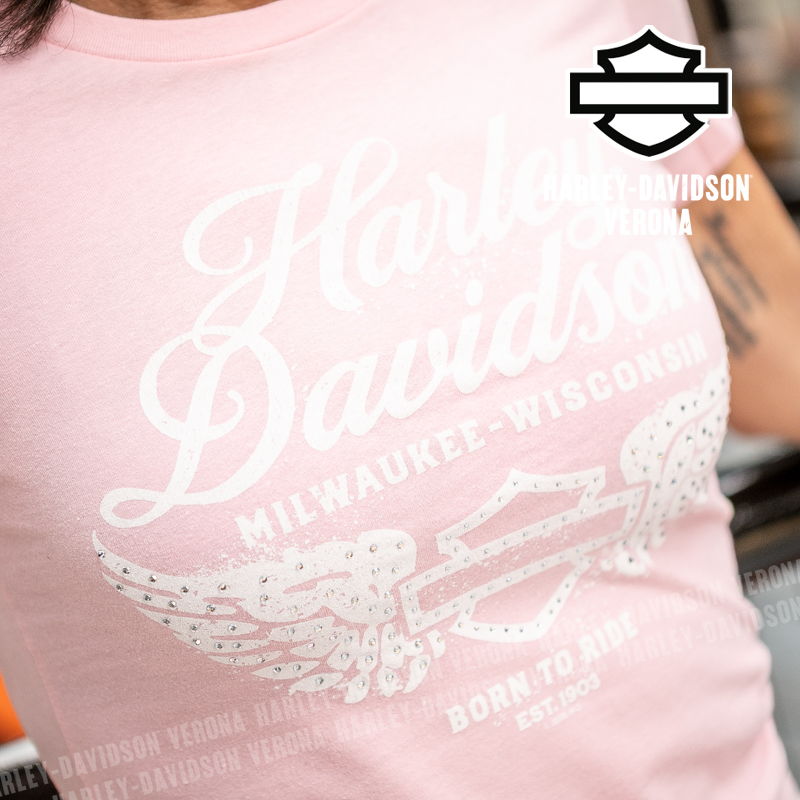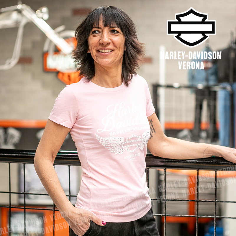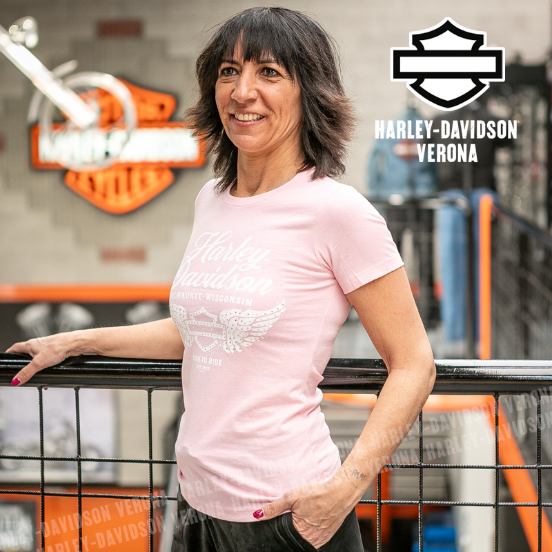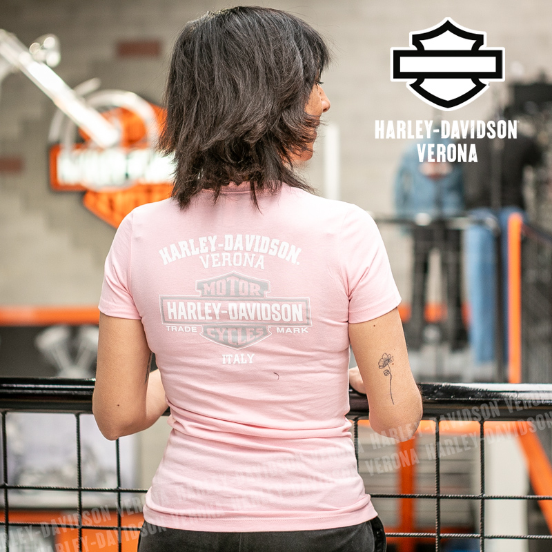 Indossa i colori di H-D® Verona! Nuovissima collezione di t-shirt 2026 in delicato rosa con Bar & Shield alato, perfetta per mostrare la tua appartenenza alla famiglia Harley-Davidson Verona o per un ricordo unico della tua visita alla città di Romeo e Giulietta! Sara è alta 165 cm e indossa la taglia XS.