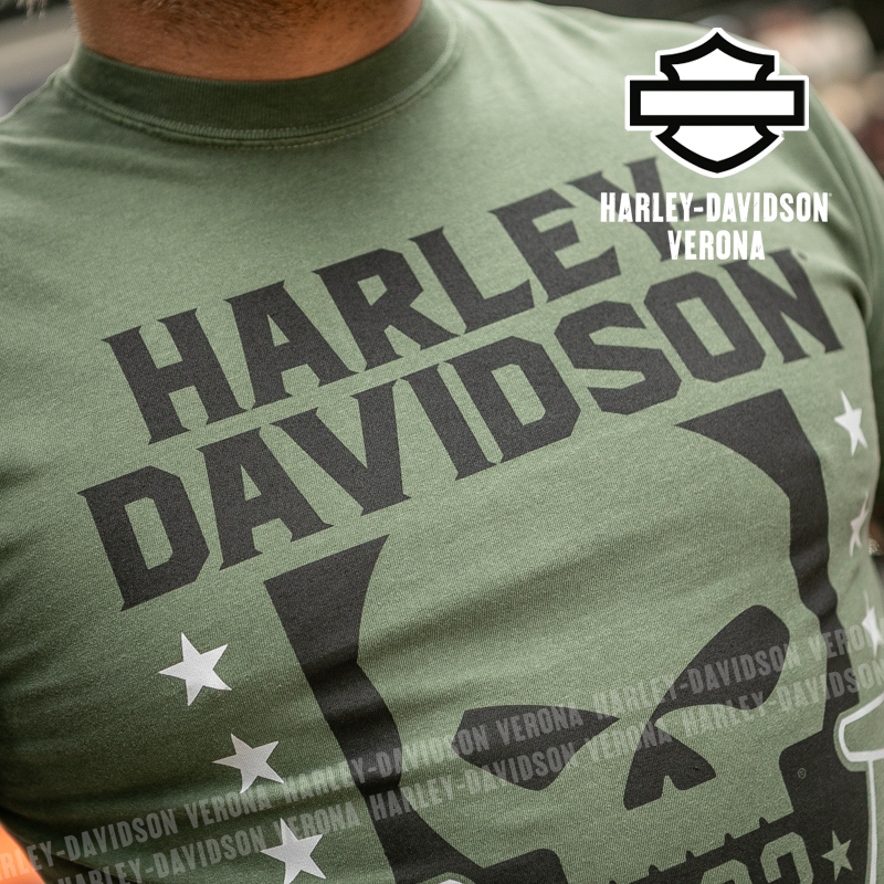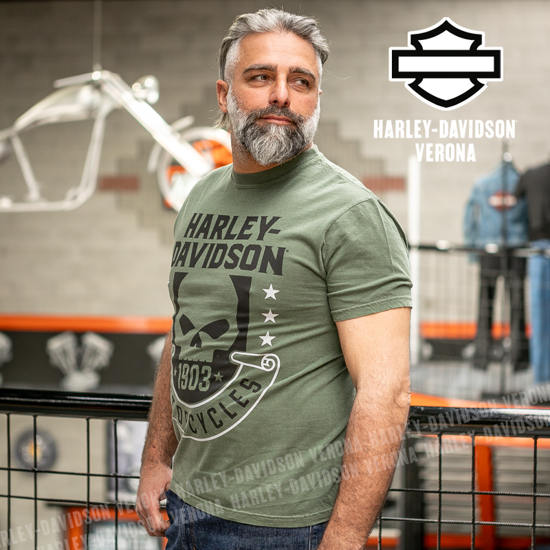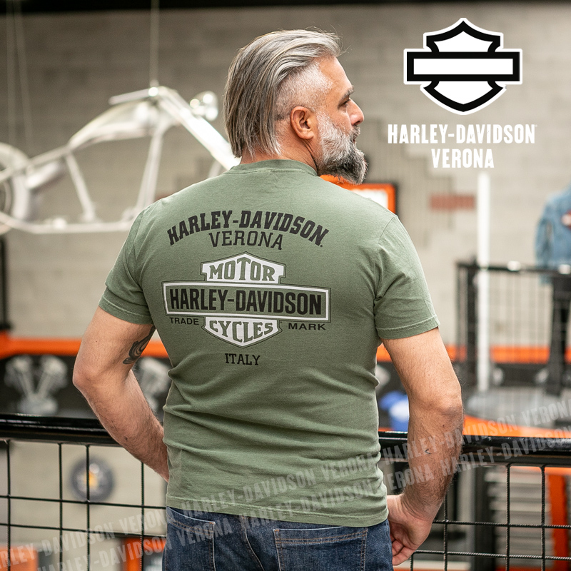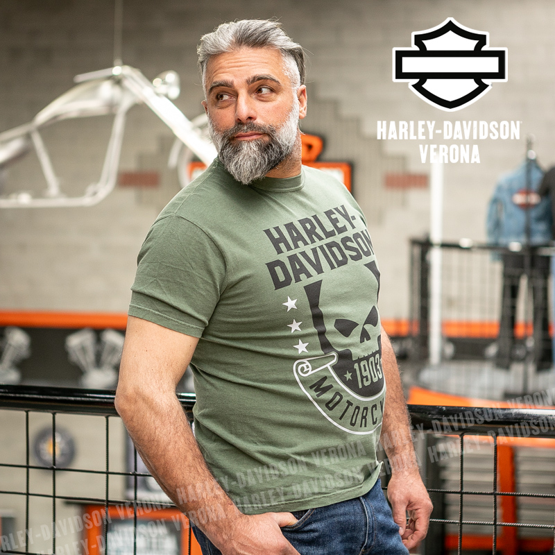 Indossa i colori di H-D® Verona! Nuovissima collezione 2026 di t-shirt in verde militare, con l’iconico teschio di Willie G e grafiche in nero, perfetta per mostrare la tua appartenenza alla famiglia Harley-Davidson Verona o per un ricordo unico della tua visita alla città di Romeo e Giulietta! Luca è alto 177 cm e indossa la taglia L.