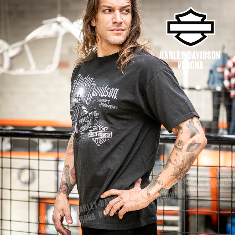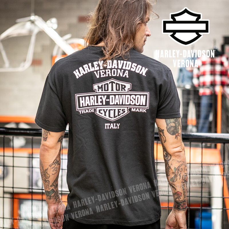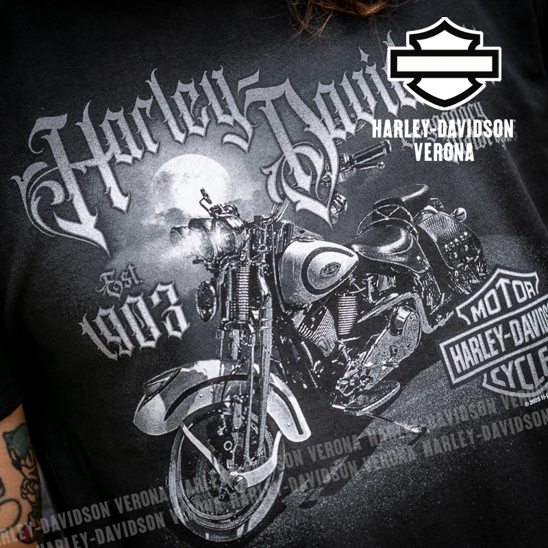 Indossa i colori di H-D® Verona! Nuovissima collezione di t-shirt 2026 in total black con moto vintage e luna in grigio e scritta gotica di sfondo, perfette per mostrare la tua appartenenza alla famiglia Harley-Davidson Verona o per un ricordo unico della tua visita alla città di Romeo e Giulietta! Timothy è alto 180 cm e indossa la taglia L.