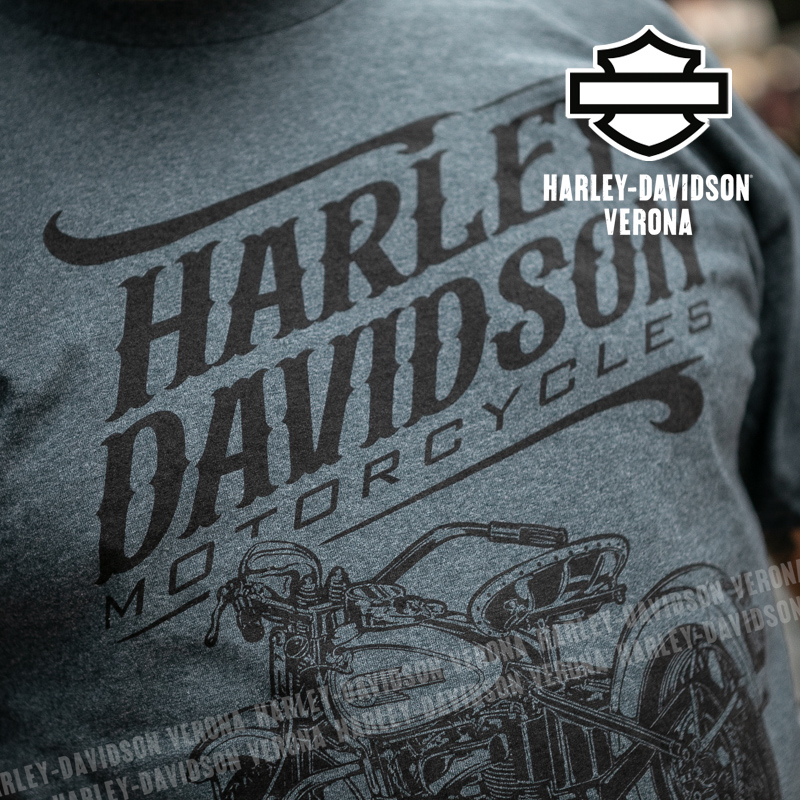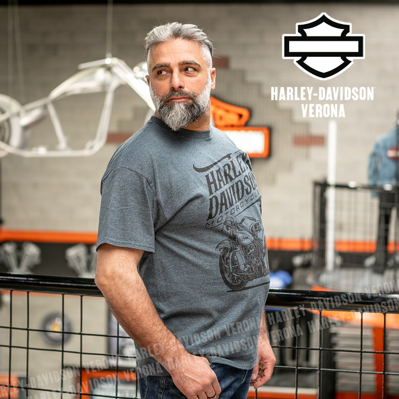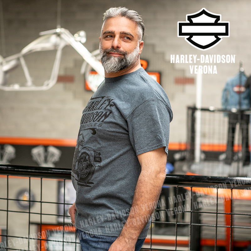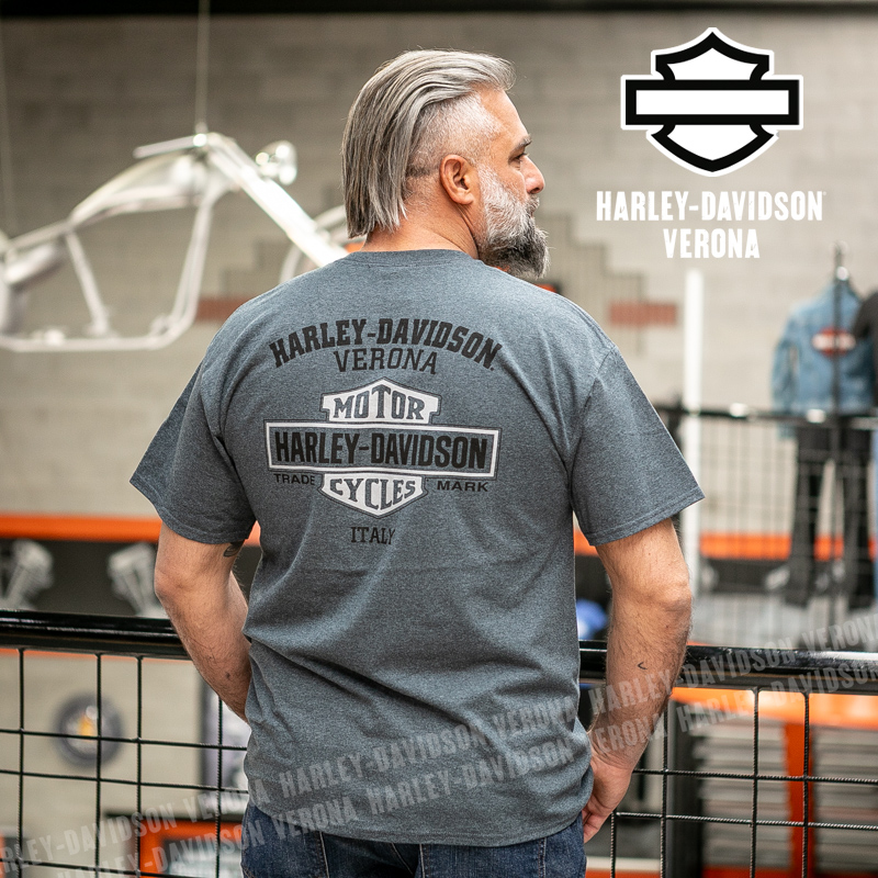 Indossa i colori di H-D® Verona! Nuovissima collezione 2026 di t-shirt in elegantissimo grigio fumo con grafiche in stile vintage, perfetta per mostrare la tua appartenenza alla famiglia Harley-Davidson Verona o per un ricordo unico della tua visita alla città di Romeo e Giulietta! Luca è alto 177 cm e indossa la taglia L.