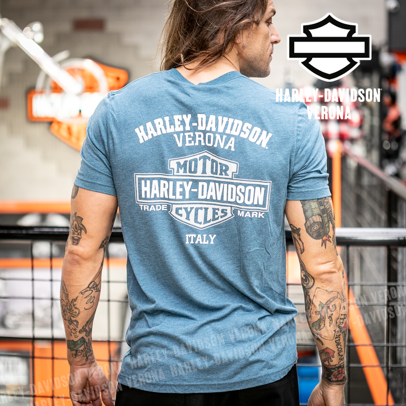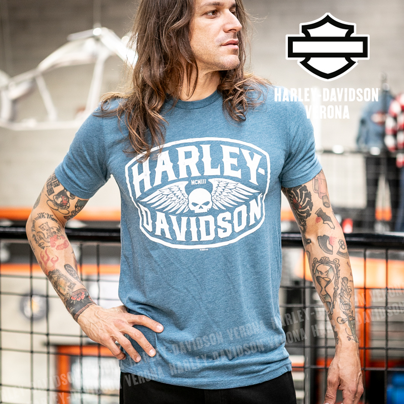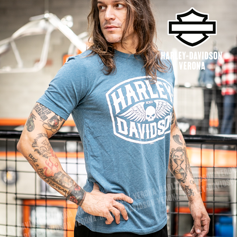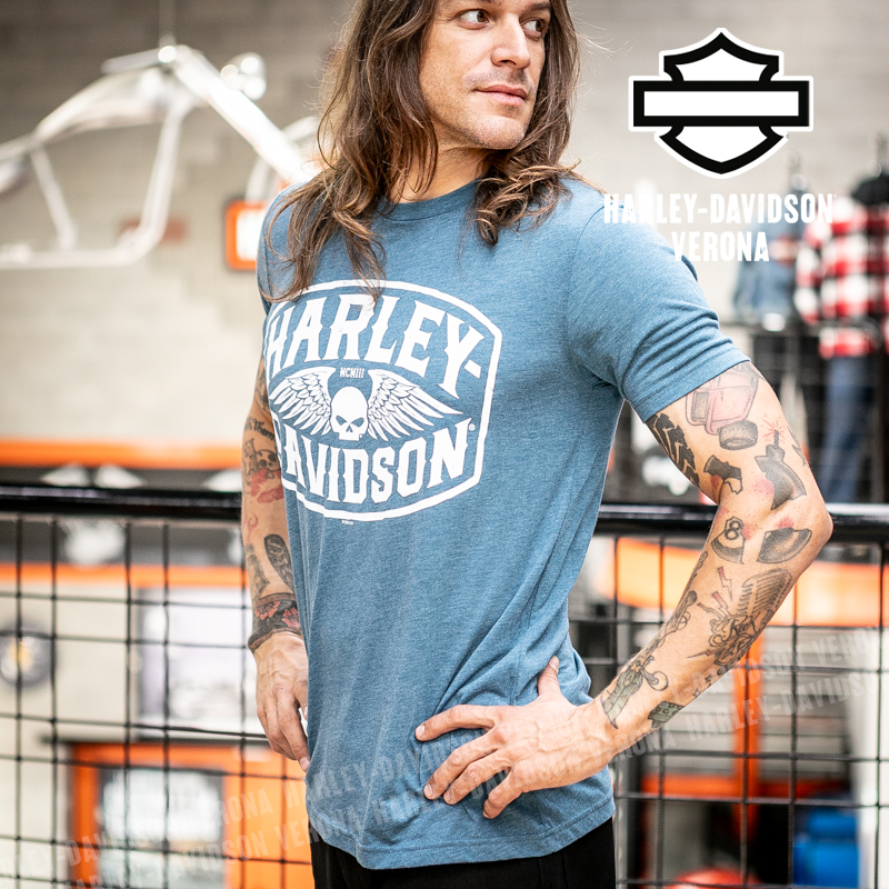 Indossa i colori di H-D® Verona! Nuovissima collezione di t-shirt 2026 in azzurro con teschio di Willie G alato, perfette per mostrare la tua appartenenza alla famiglia Harley-Davidson Verona o per un ricordo unico della tua visita alla città di Romeo e Giulietta! Timothy è alto 180 cm e indossa la taglia L.