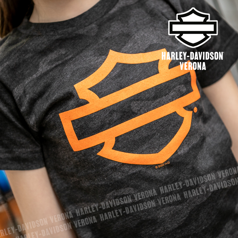 Indossa i colori di H-D® Verona! Nuovissima collezione di t-shirt da bambina e bambino camouflage con grafica B&S arancione, perfetta per mostrare la tua appartenenza alla famiglia Harley-Davidson Verona o per un ricordo unico della tua visita alla città di Romeo e Giulietta! Nicholy ha 8 anni e indossa la taglia S, Nicholas ha 12 anni e indossa la taglia M.