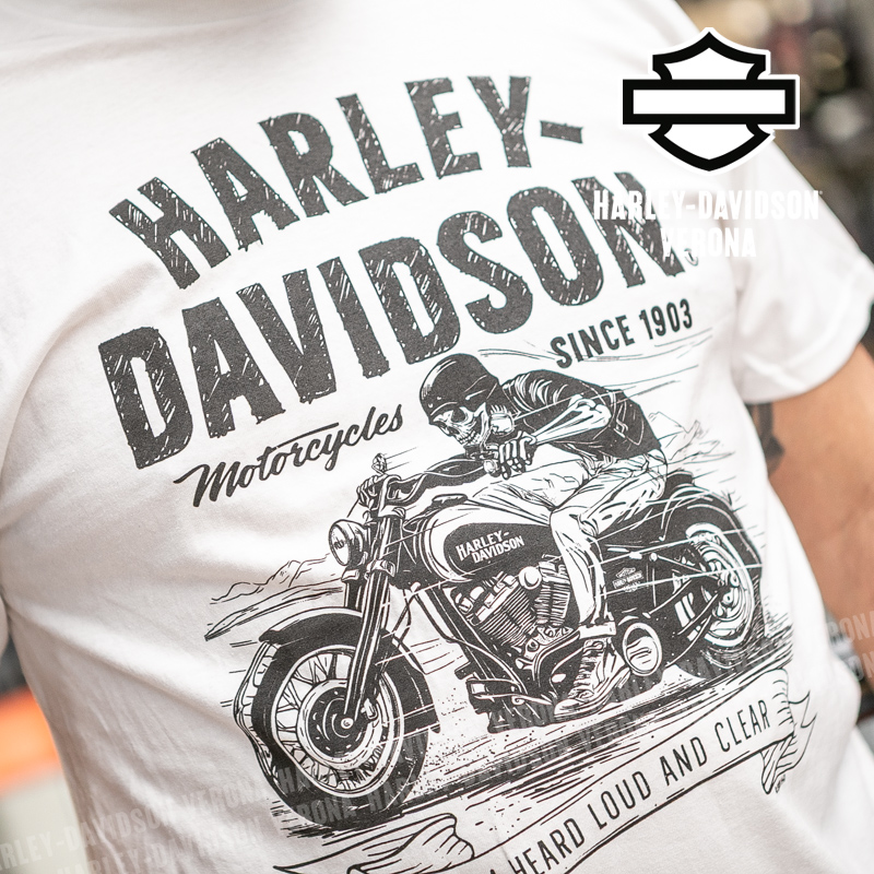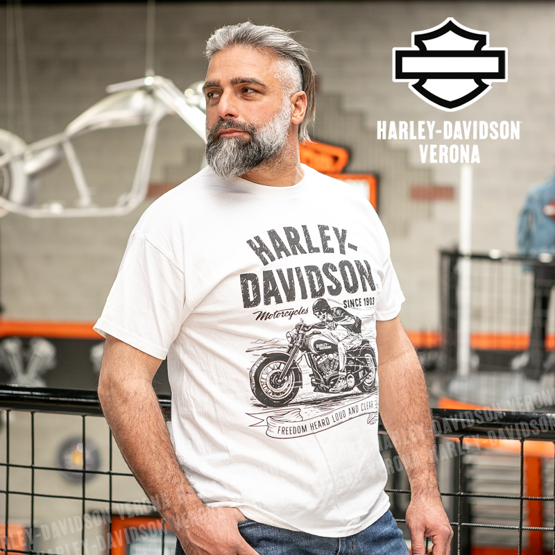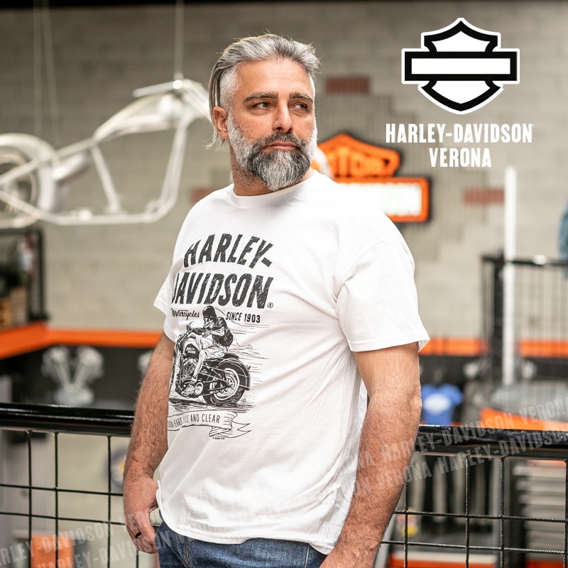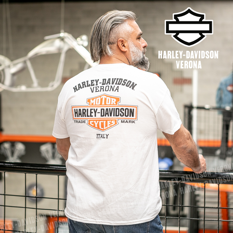 Indossa i colori di H-D® Verona! Nuovissima collezione 2026 di t-shirt in freschissimo bianco con grafica vintage in nero, perfetta per mostrare la tua appartenenza alla famiglia Harley-Davidson Verona o per un ricordo unico della tua visita alla città di Romeo e Giulietta! Luca è alto 177 cm e indossa la taglia L.