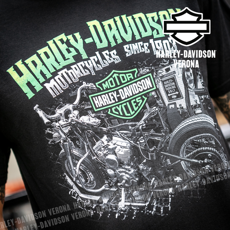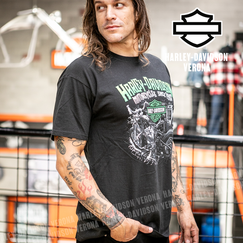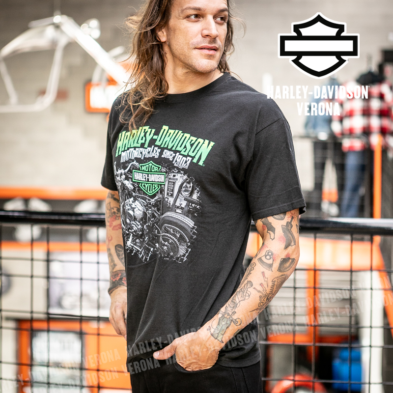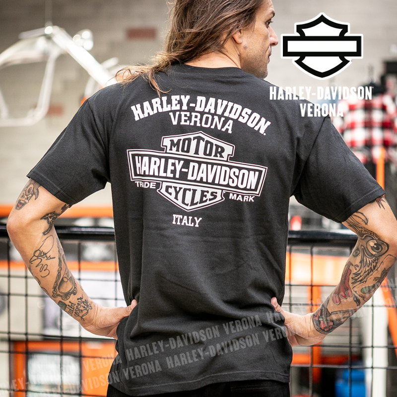 Indossa i colori di H-D® Verona! Nuovissima collezione di t-shirt 2026 in total black con grafica in verde, perfette per mostrare la tua appartenenza alla famiglia Harley-Davidson Verona o per un ricordo unico della tua visita alla città di Romeo e Giulietta! Timothy è alto 180 cm e indossa la taglia L.