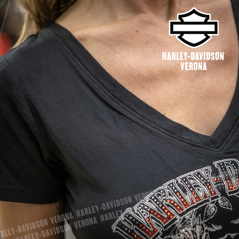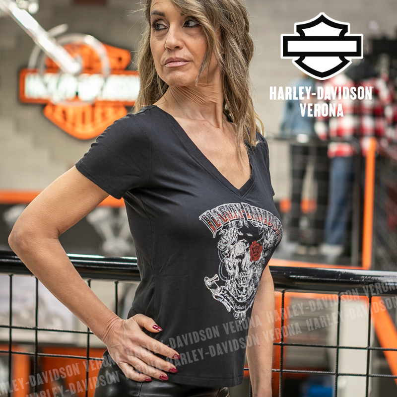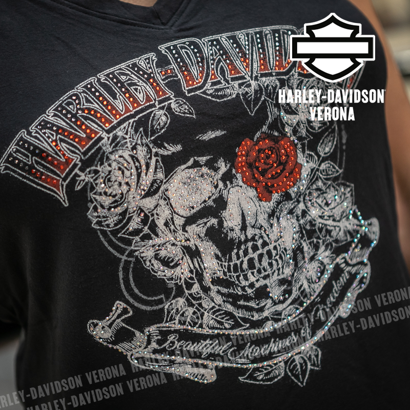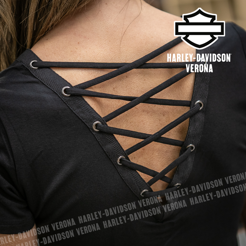 Porta il tuo stile motociclistico a un livello superiore con la nostra maglietta a maniche corte e lacci sulla schiena Bling Afterlife. Questa edizione speciale è realizzata in un taglio di jersey di super morbido rayon pesante da 225 g/m² con un tocco di Spandex per una maggiore elasticità. Ha una seducente scollatura a V con allacciatura incrociata e occhielli in metallo. La grafica accattivante è tutta sulla parte anteriore ed è sapientemente decorata con strass. Rendi tuo questo look distintivo prima che le scorte vadano in esaurimento. Cristina è alta 165 cm e indossa la taglia XS.