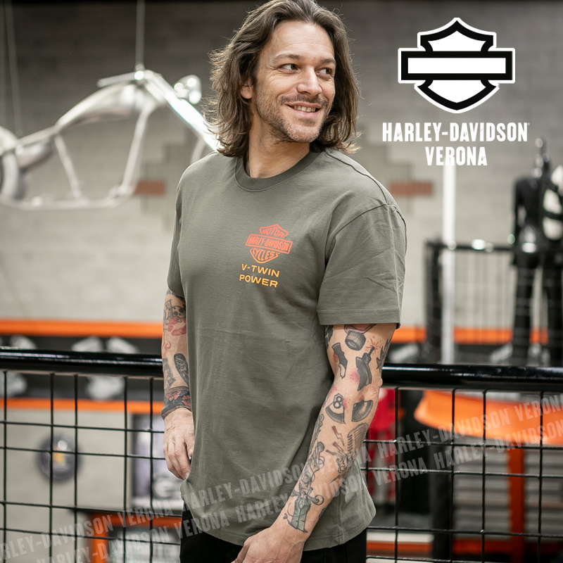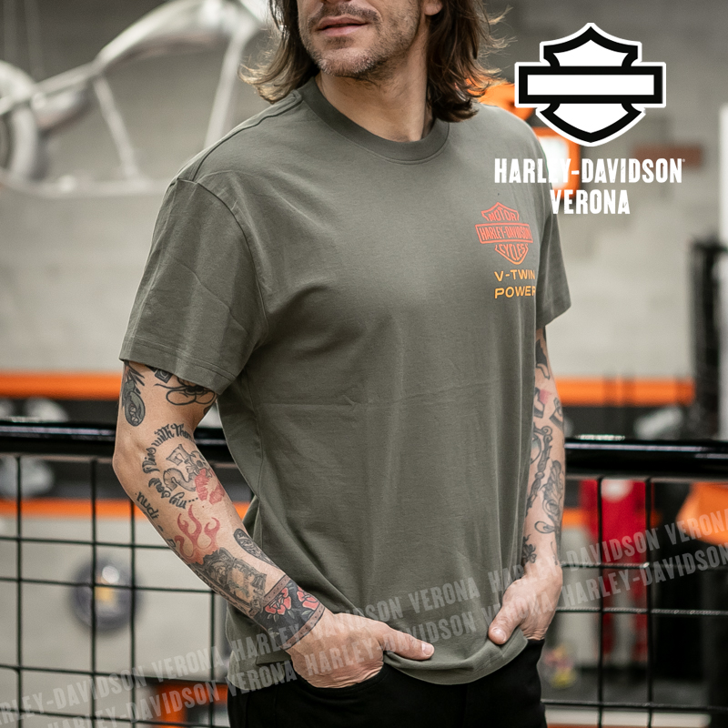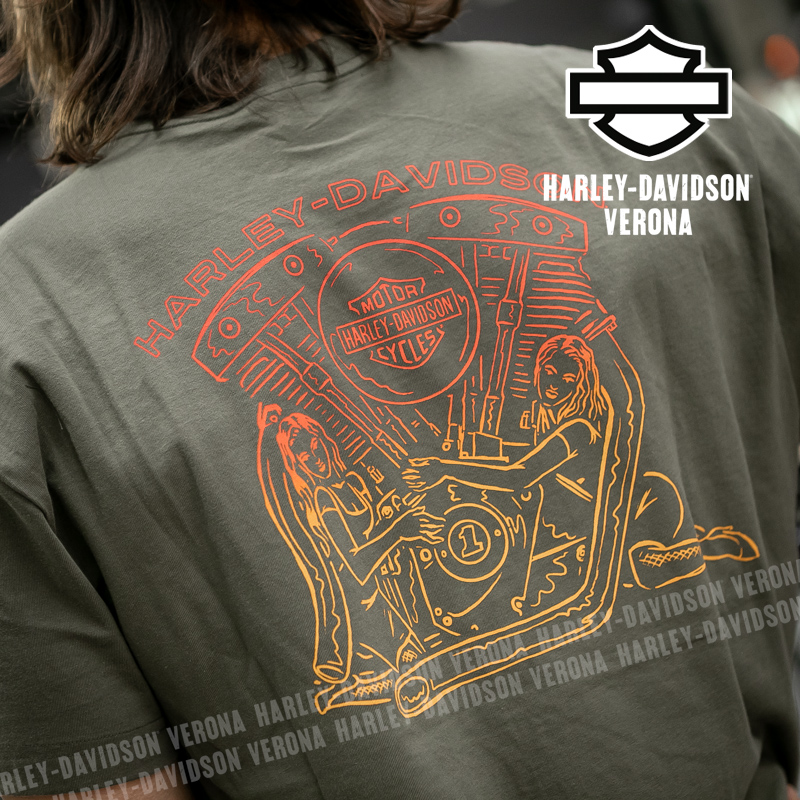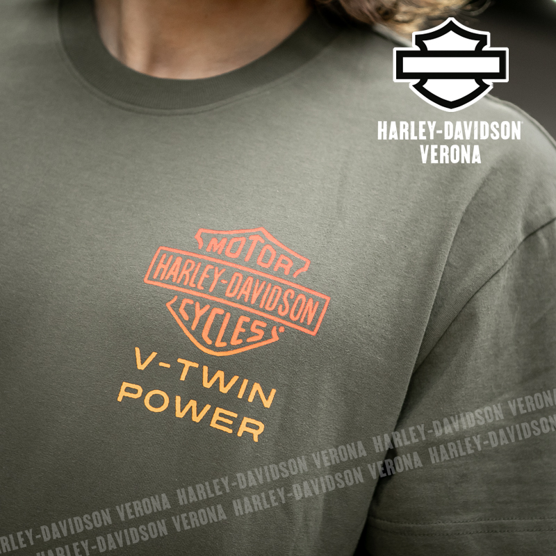La potenza del bicilindrico viene celebrata nella nostra maglietta a maniche corte H-D® Engine Twins in edizione limitata. Realizzata in jersey di cotone traspirante al 100%, questa t-shirt da uomo offre un comfort duraturo e una vestibilità comoda, mentre la scollatura a coste aiuta a mantenerne la forma. È rifinita in modo vivace con una grafica ispirata ai motori in stile sfumato, per un look davvero unico. Ordinala subito prima che vada esaurita!