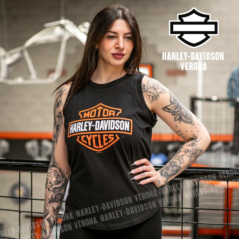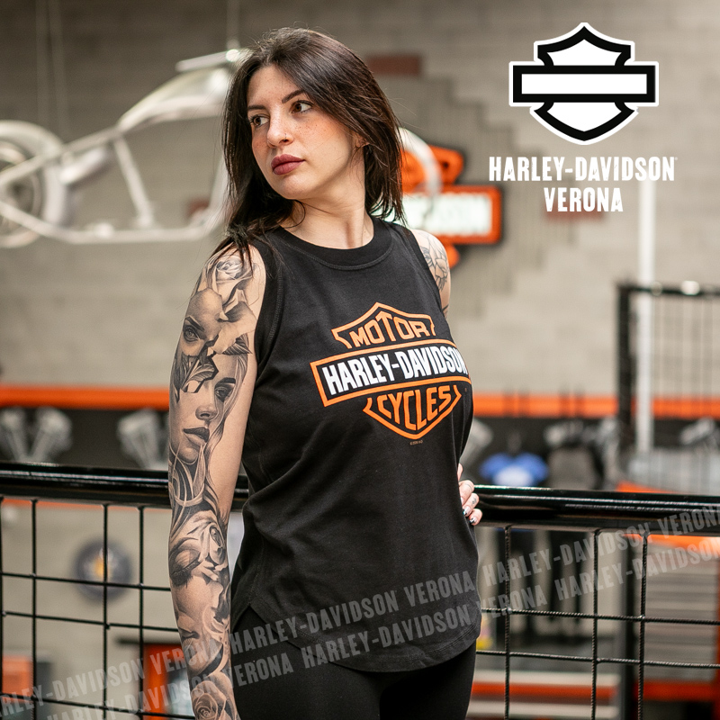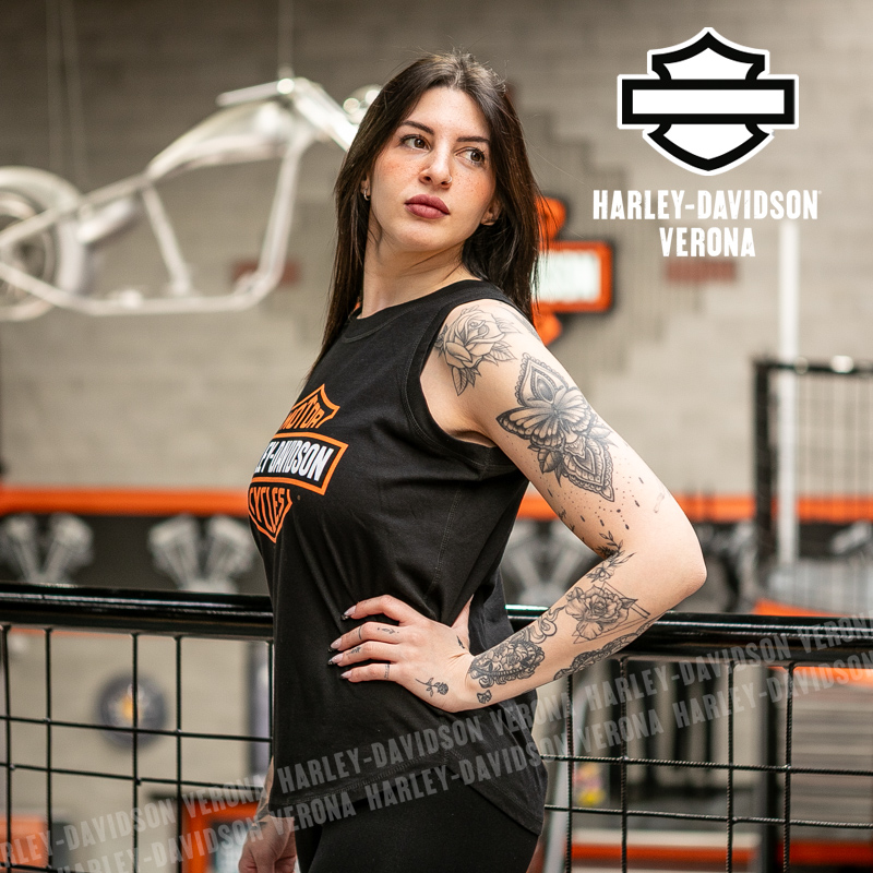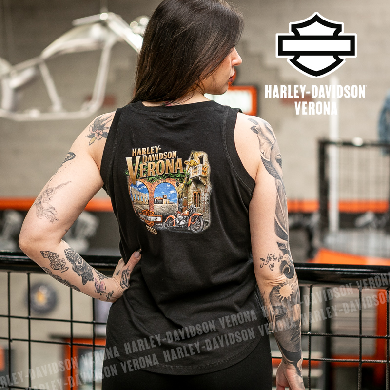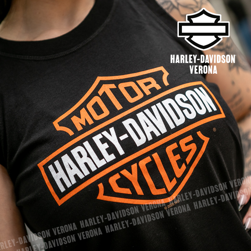 Indossa i colori di H-D® Romeo&Giulietta! Nuovissima collezione 2026 di t-shirt senza maniche in classico nero con Bar & Shield in arancio e bianco, perfette per mostrare la tua appartenenza alla famiglia Harley-Davidson Verona o per un ricordo unico della tua visita alla città di Romeo e Giulietta! Lucia è alta 170 cm e indossa la taglia M.