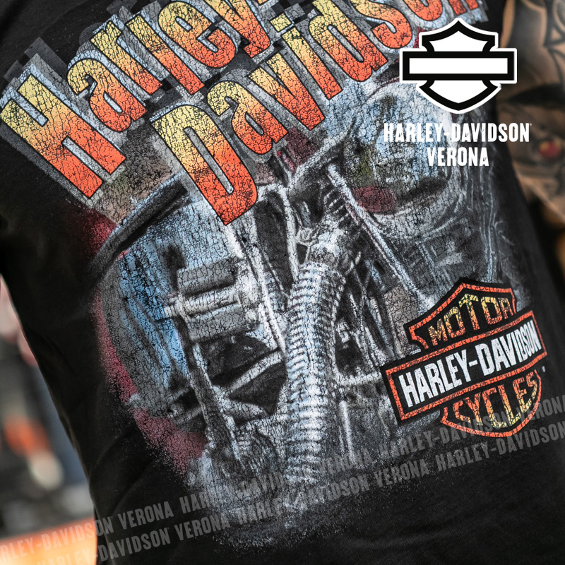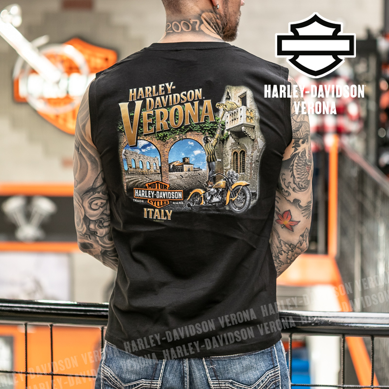 Indossa i colori di H-D® Romeo&Giulietta! Nuovissima collezione di t-shirt senza maniche 2026 in total black con grafica motociclistica e scritte arancioni, perfette per mostrare la tua appartenenza alla famiglia Harley-Davidson Verona o per un ricordo unico della tua visita alla città di Romeo e Giulietta! Sebastiano è alto 190cm e indossa la taglia L.