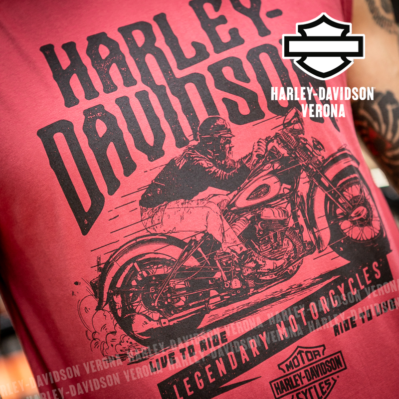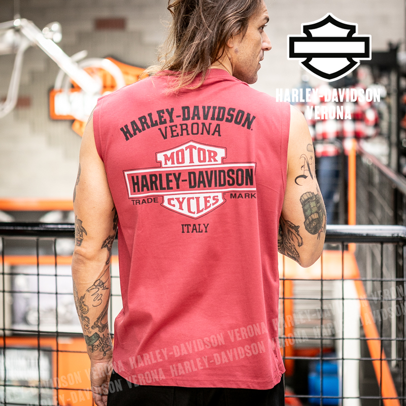 Indossa i colori di H-D® Verona! Nuovissima collezione di t-shirt senza maniche 2026 in rosso con grafica vintage e scritte in nero, perfette per mostrare la tua appartenenza alla famiglia Harley-Davidson Verona o per un ricordo unico della tua visita alla città di Romeo e Giulietta! Timothy è alto 180 cm e indossa la taglia L.