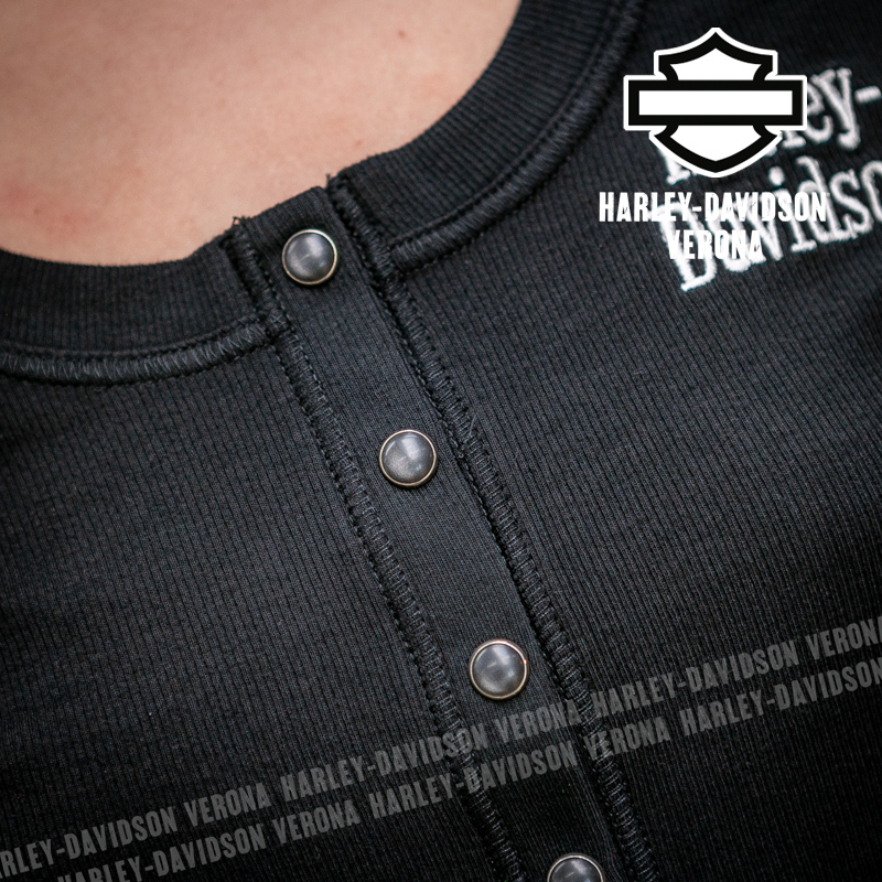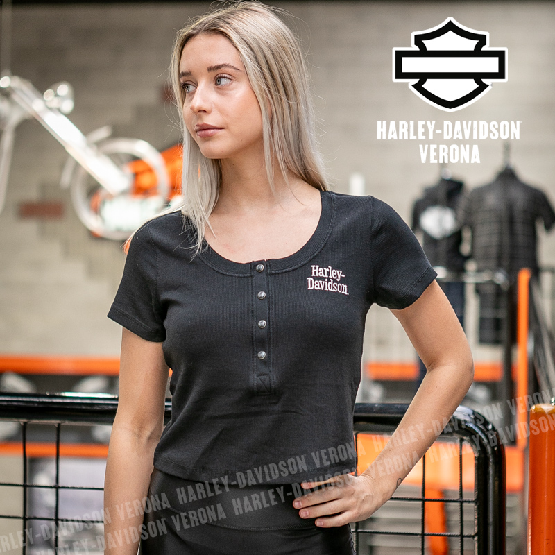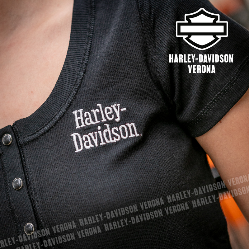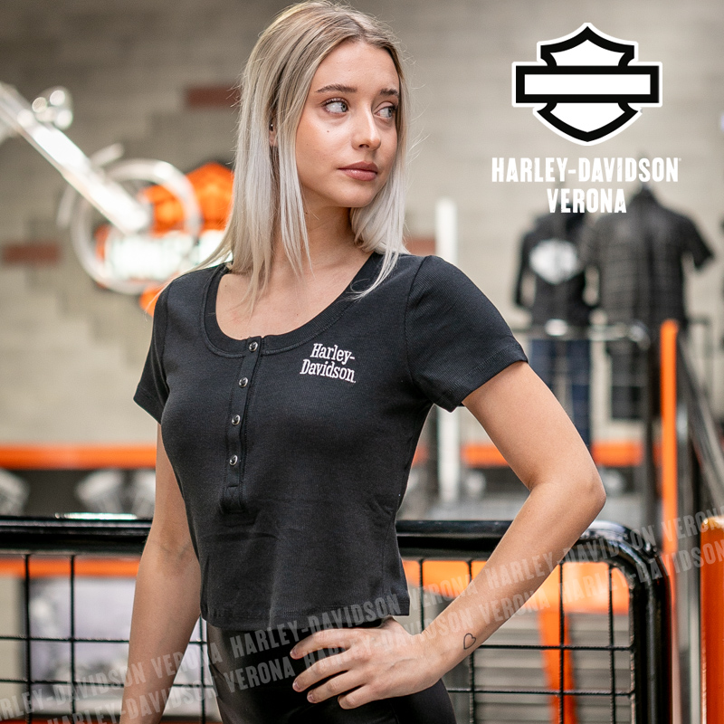 La tua nuova t-shirt che si abbina a tutto sarà certamente questo serafino in maglia a costine e in edizione limitata. Con la sua vestibilità attillata e corta e lo scollo a barchetta è davvero super femminile e risalta le tue forme. Realizzata in misto 58% cotone, 38% modal con un poco di Spandex per darle maggiore elasticità, ha l’abbottonatura a serafino ed è abbellita da un discreto ricamo sul davanti per un look H-D molto sobrio. Una curiosità: la grafica qui imita quella vista sulle nostre uniformi da gara degli anni ’70. Pamela è alta 167 cm e indossa la taglia XS.