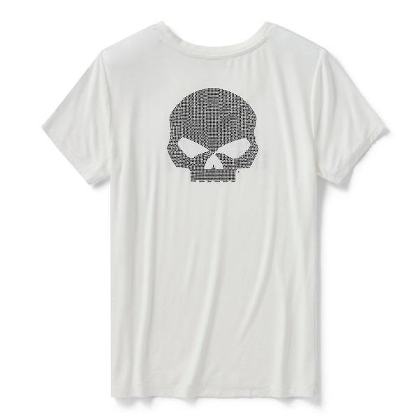 Esalta il tuo look casual con la t-shirt Willie G™ Skull Bling! Pensata per offrire la massima comodità, è realizzata in jersey di rayon ultra-morbido con un pizzico di Spandex per aumentarne l’elasticità, ha un elegante scollo a V e una splendida grafica in strass che mette in risalto l’iconico teschio di Willie G. Una pillola di storia: benché proprio il teschio sia una delle creazioni più famose di Willie G. Davidson, firmò anche diverse motociclette, tra cui la FX Super Glide® del 1971 e la Low Rider® FXS del 1977. Disponibile anche in classico nero.