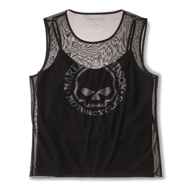 Lo stile layering assume un tocco scintillante nel nostro top Willie G™ Skull Bling Mesh! Lo strato esterno in leggera rete 95% poliestere, 5% spandex e la canotta interna rimovibile in jersey 60% poliestere, 30% cotone, 7% spandex sono tagliati più corti per una silhouette che valorizza la figura. Insieme creano un look raffinato e impeccabile, ma possono essere indossati anche separatamente, con altri capi del tuo guardaroba. Lo strato in rete è caratterizzato da una splendida grafica in strass che mette in risalto l’iconico teschio Willie G. Una pillola di storia: benché proprio il teschio sia una delle creazioni più famose di Willie G. Davidson, firmò anche diverse motociclette, tra cui la FX Super Glide® del 1971 e la Low Rider® FXS del 1977. Disponibile anche in bianco e in rosa antico.